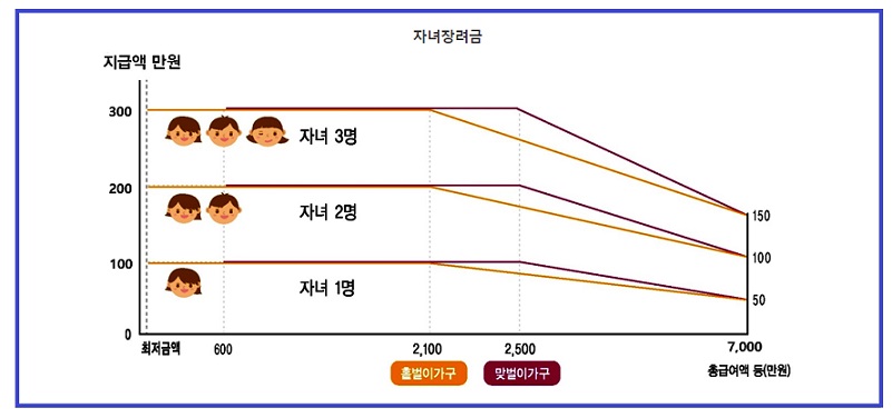 → 홑벌이 가구의 경우 연소득이 2,100만 원 이하일 경우 자녀 1인당 100만 원씩 지급되며, 연소득이 2,100만 원 ~ 7,000만 원일 경우 지급받을 수 있는 금액은 감소되며 최소 50만 원 이상으로 지급받을 수 있습니다.